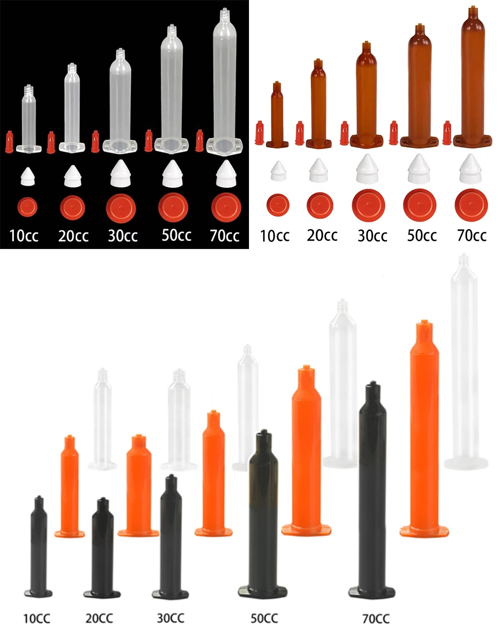 透明シリンジは、あらゆる種類の電子封止接着剤、導電性接着剤、フラックス、SMTパッチ赤色接着剤、潤滑剤、塗料などに適しています。黒色は、UV接着剤、光硬化型接着剤、および黒色の陰影が必要な場所に適しています。琥珀色は、一般的なUV保護の職場に適していますが、UV接着剤の長期保管はお勧めしません。